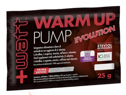 + Watt Warm Up Pump Evolution 25 гр - это предтренировочная добавка в пакетиках с разовой дозой, состоящая из состава на основе углеводов, аргинина, таурина, бета-аланина и кофеина, разработанного для разогрева мышц перед интенсивными занятиями спортом.