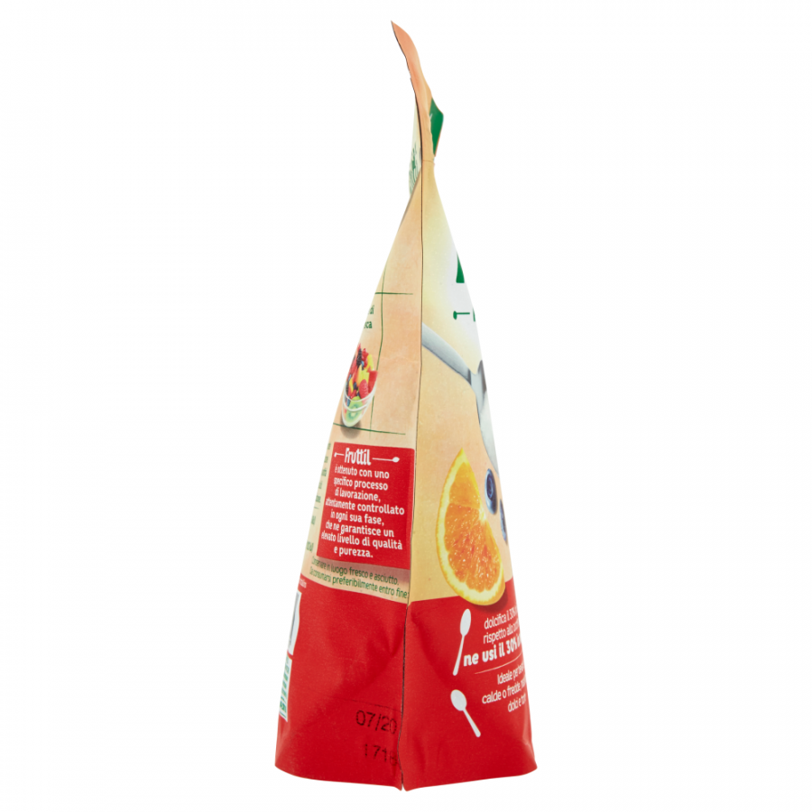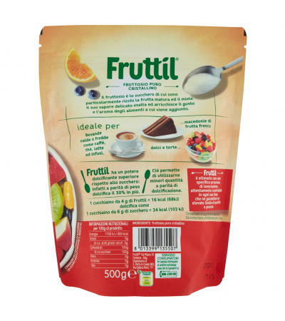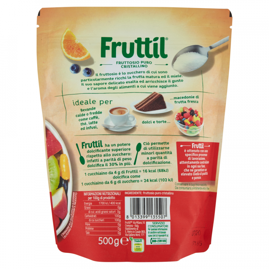Фруктоза - это сахар, которым особенно богаты спелые фрукты и мед. Ее нежный аромат усиливает и обогащает вкус и аромат продуктов, в которые она добавлена. Идеально подходит для горячих или холодных напитков, таких как кофе, чай, молоко и настои, сладости и пирожные, салаты из свежих фруктов. Fruttil обладает большей подслащивающей способностью, чем сахар: фактически, при том же весе он подслащивает на 30% больше. Это позволяет использовать меньшие количества для того же подслащивания. 1 чайная ложка 4 г фруттила = 16 ккал (68 кДж). Фруттил получают с помощью специального производственного процесса, тщательно контролируемого на каждой фазе, что гарантирует высокий уровень качества и чистоты.