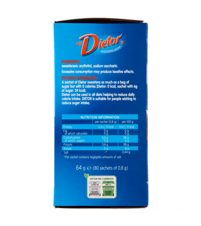 MyDietor, самый любимый итальянцами подсластитель: инновации и качество гарантированы! Без калорий - сладкий, как сахар, легкий, как воздух! Половина чайной ложки myDietor (0,8 г) подслащивает, как пакетик сахара, но с нулевым содержанием калорий, что обеспечивает отличную растворимость для всех напитков. Без аспартама! Чистая сладость! MyDietor, чтобы обеспечить лучший вкус, использует новую формулу на основе сахарина и эритрита. Эритритол - специальный ингредиент, улучшающий органолептические характеристики новой формулы. Мы отбираем только лучшие ингредиенты для получения сбалансированной формулы и однородной сладости. Выразите все свои творческие способности на кухне, не жертвуя вкусом и легкостью. MyDietor подходит для приготовления пищи даже при высоких температурах. Идеально подходит для приготовления тортов, десертов и вкусных фруктовых салатов. Тщательный отбор сырья и контроль производственного процесса MyDietor гарантируют высокое качество этого продукта.