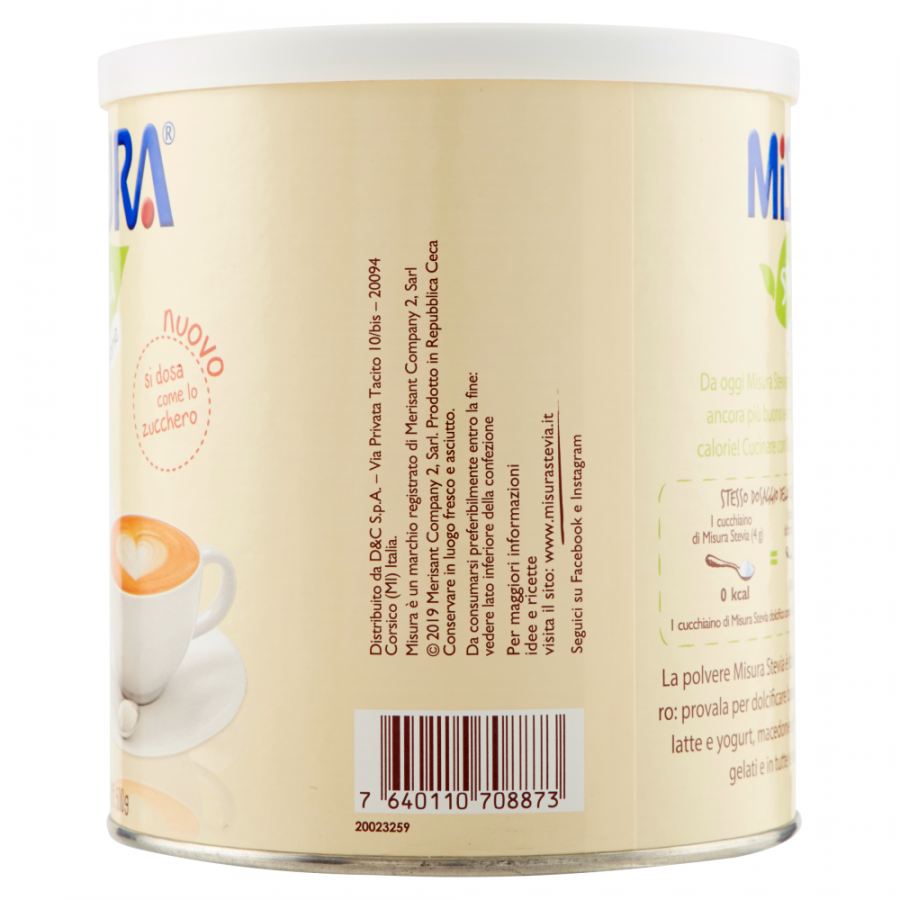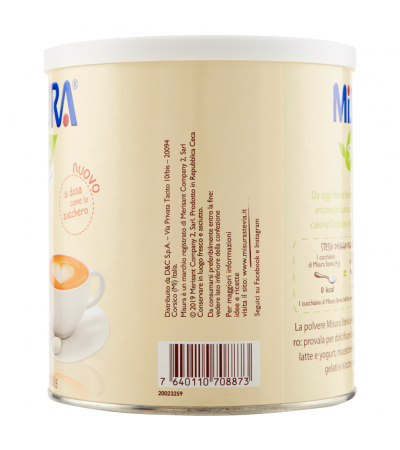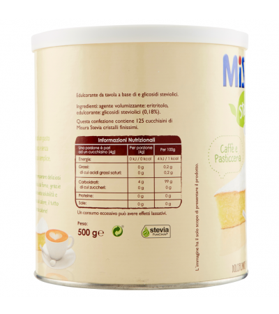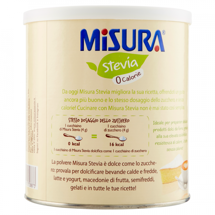 1 чайная ложка Misura Stevia (4 г) 0 ккал = 1 чайная ложка сахара (4 г) 16 ккал. Порошок стевии Misura сладок, как сахар: попробуйте подсластить горячие и холодные напитки, молоко и йогурт, фруктовые салаты, парфе, мороженое и во всех своих рецептах!