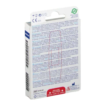 Центральная прокладка: закругленные углы для улучшения прилегания к ране. Марлевые тампоны из нетканого материала с микроперфорированной антипригарной пленкой. Марля содержит 0,5% диглюконата хлоргексидина, обладающего антибактериальным действием.
