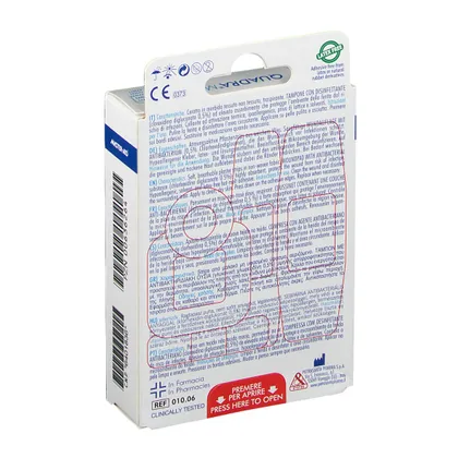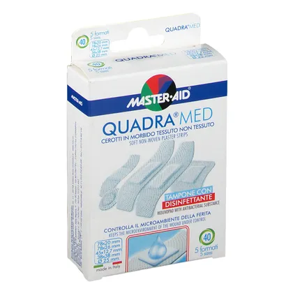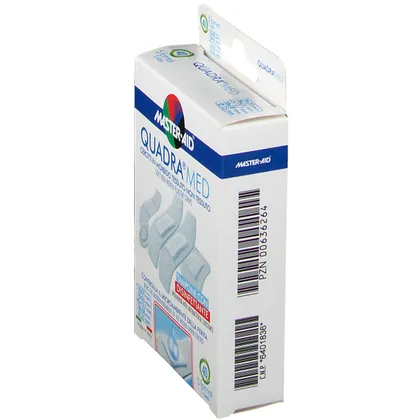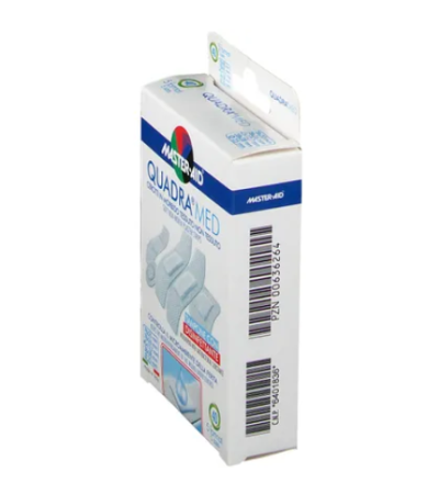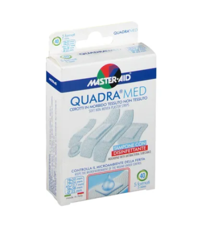 Quadra Med - это пластыри из нетканого материала, снабженные впитывающей подушечкой с дезинфицирующим веществом (хлоргексидина диглюконат 0,5%). Гипоаллергенный клей, не содержащий растворителей и натурального латекса. Каждый пластырь имеет эксклюзивную запатентованную эргономичную форму. Используется в основном для лечения ран с повреждением дермы, которые могут зажить вторичным натяжением. Его функция - контролировать микросреду раны и создавать барьер с внешней стороны. Показан при небольших поражениях, в частности, при наличии нежной, чувствительной и раздраженной кожи.